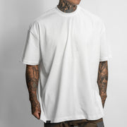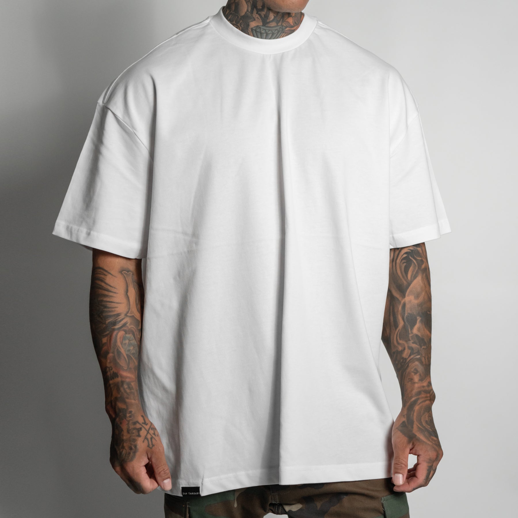 An essential reimagined with understated precision. This oversized tee is cut in a relaxed silhouette with a dropped shoulder, balancing structure and ease. The neckline is reinforced with a wide ribbed collar, lending both strength and refinement, while single-needle edge stitching offers a discreet nod to meticulous craftsmanship. Crafted from an ultra-soft, tightly knit fabric, it falls with an elegant weight and smooth hand. Side-seamed tailoring ensures a clean, architectural line — a foundation piece elevated to timeless luxury.