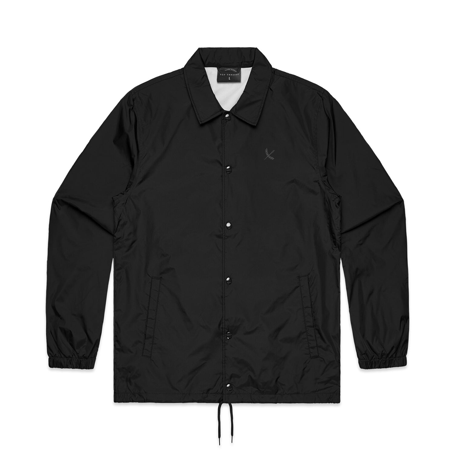 - Collared jacket, two side pockets, snap dome to close, drawcord at hem, elastic cuffs